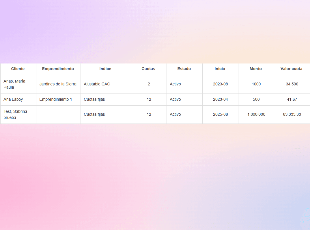 Todas las ventas financiadas, con actualización mensual por índices, emisión de recibos e integración con PagoTIC para el cobro online de cuotas.