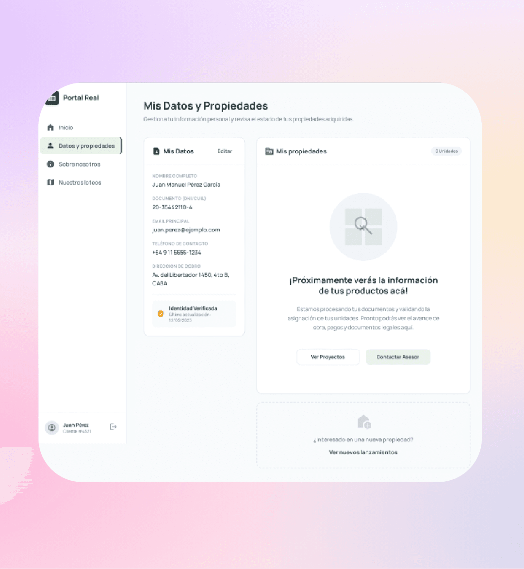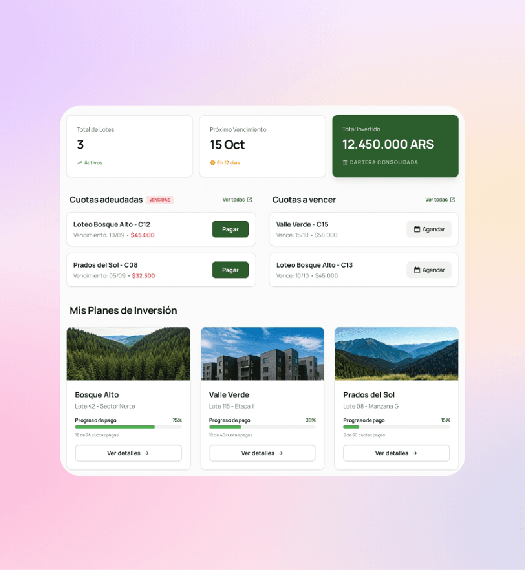 En el portal de autogestión los clientes podrán ver los productos que te compraron y su documentación, su estado de cuenta de las compras financiadas con la posibilidad de subir recibos y un formulario para generar consultas o reclamos.